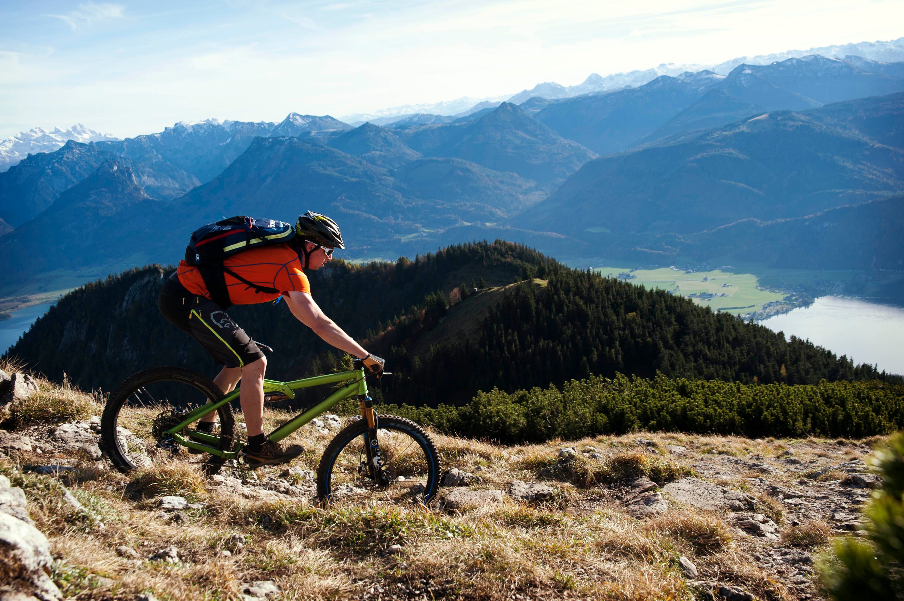 Am Samstag geht‘s Richtung Wolfgangsee. Dort haben Heidelberg’s Finest noch eine Rechnung offen. Vor mehr als 6 Monaten war Andy hier schwer gestürzt aber heute soll es besser laufen. Neben Andy, Tobi und Mark von Heidelberg’s Finest Mountain Bike Trails sind auch ein paar Locals aus Salzburg am Start. Wir schwingen uns aufs Rad und genießen das wolkenlose Panorama und die Laubfärbung, die mit jedem Höhenmeter mehr ins Auge sticht. Bis zur Baumgrenze kommen wir gut voran, dann müssen wir die Bikes schultern und geduldig Fragen von immer mehr ungläubigen Wanderern beantworten. Der Gipfel wird auch von einer Bergbahn bedient und je näher wir unserem Ziel kommen, umso mehr ist auch los auf den Trails.