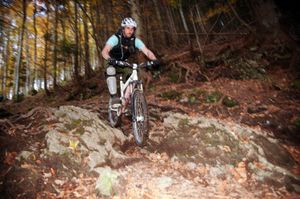 Sonntagmorgen schlafen wir nicht aus, früh morgens wird geshuttelt. Wir wollen uns an der knackigsten Abfahrt von Salzburgs Hausberg versuchen. Das Ding entpuppt sich als wirklich harte Nummer. Wir packen uns mehrfach auf die Fresse, aber im zweiten und dritten Anlauf lassen sich die meisten kniffligen Passagen fahren. Nur bei einigen wenigen Spitzkehren, die mit Holzleitern versichert sind, müssen wir absteigen. Bevor wir zurück nach Salzburg rollen, machen wir noch den ein oder anderen Abstecher, nehmen ein paar Switchbacks mit und surfen über herbstlich laubige Trails.