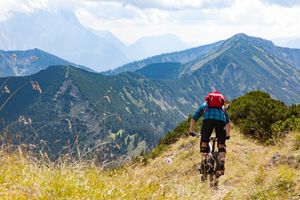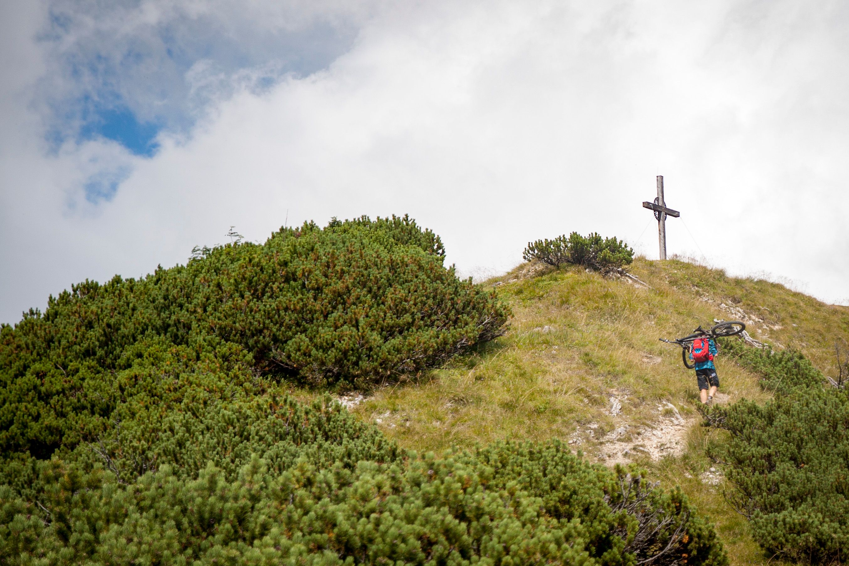 15.15 Uhr - Wir beschließen, dass es 14.50 Uhr ist und tragen unsere Bikes weiter zum Gipfel. Oben angekommen gibt’s ein Gipfelsnickers in Weiss, phantastische Weitsicht auf die Garmischer Hausberge, ins Karwendel, die Ammergauer Berge und das Voralpenland. Dennoch stärken wir uns nur kurz, legen die Schoner an und beginnen mit der Abfahrt. Ganz im Gegensatz zu gestern, sind heute viele Passagen fahrbar, die wir beim Aufstieg kritisch beäugt haben. Während der Trail im Gipfelbereich recht loses Geröll aufweist und sich auch zwei/drei unfahrbar hohe Wurzelstöcke finden, wird es ab dem Hasenjöchl zunehmend flüssiger zu fahren.