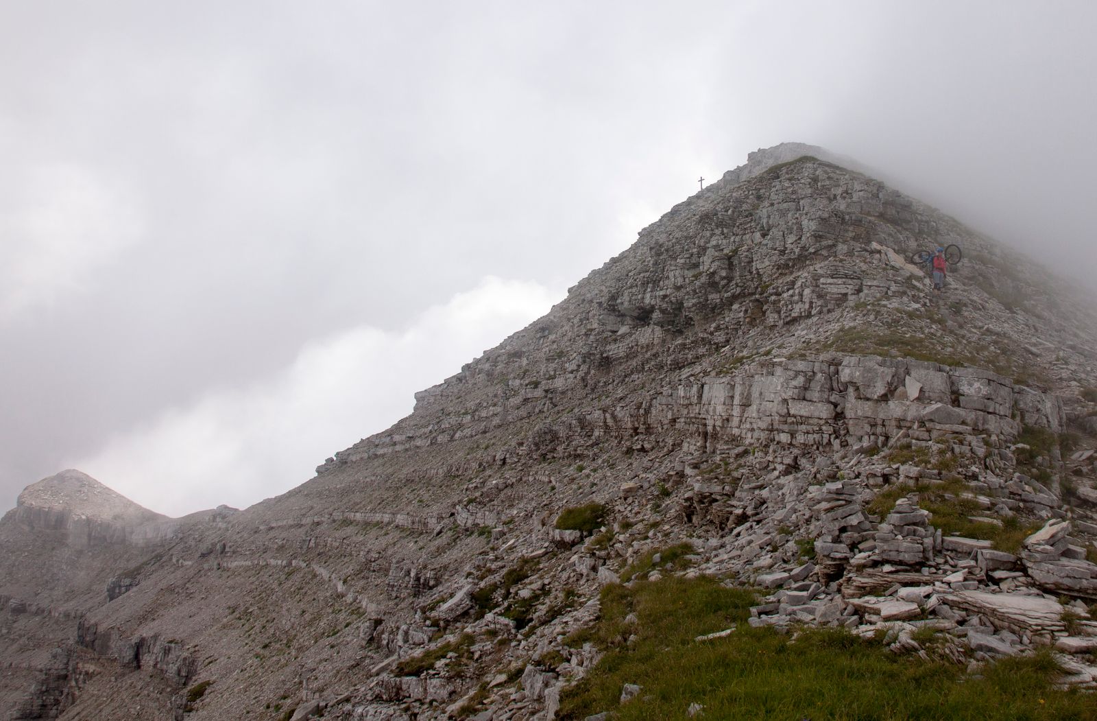 12.00 Uhr – Ich erreiche als erster den Gipfel und ziehe sofort trockene Klamotten an und suche mir ein etwas windgeschütztes Plätzchen. Leider geben die Wolken den Blick nicht wirklich frei auf die umliegenden Berge.