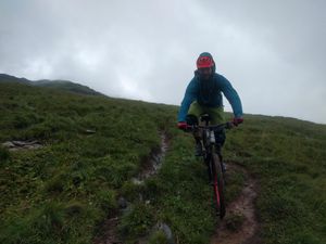 Wir passierten einen herrlichen Bergsee bevor wir eine fettige Steilstufe überschreiten mussten. Enge Serpentinen und ordentlich vom Regen aufgeschwemmt - das könnte in der Abfahrt witzig werden. Danach wurde der Boden steiniger und die Aussicht offener. Was auch das aufkommende Unwetter offenbarte. Hm, was tun? Wir waren vermutlich auf 2000 Metern, das schönste Stück lag noch vor uns. Der Gipfel war schon in Sicht. Ich konnte mich durchsetzen und wir gingen weiter. Mittlerweile die Räder auf dem Rücken Richtung Gipfelaufbau. Ein herrlicher Grat aus Schiefer. Gestern träumten wir uns schon während der Planung in die Abfahrt dessen… das wir hier Unwetter haben, kam in unserem Träumen nicht vor. Aber gut. Die gut gelaunte Wandergruppe kam auch nicht vor. Die gute Laune des Bergführers bezüglich unseres Vorhabens bestärkte uns aber darin weiter zu gehen. Allerdings kamen auch jetzt die Wolken und hüllten uns in eine Sicht, die nicht weiter als 20 Meter reichte und vor allem starken Platzregen brachte. Wir erhöhten unser Tempo und kamen am Gipfel an. Aussicht: Fehlanzeige.