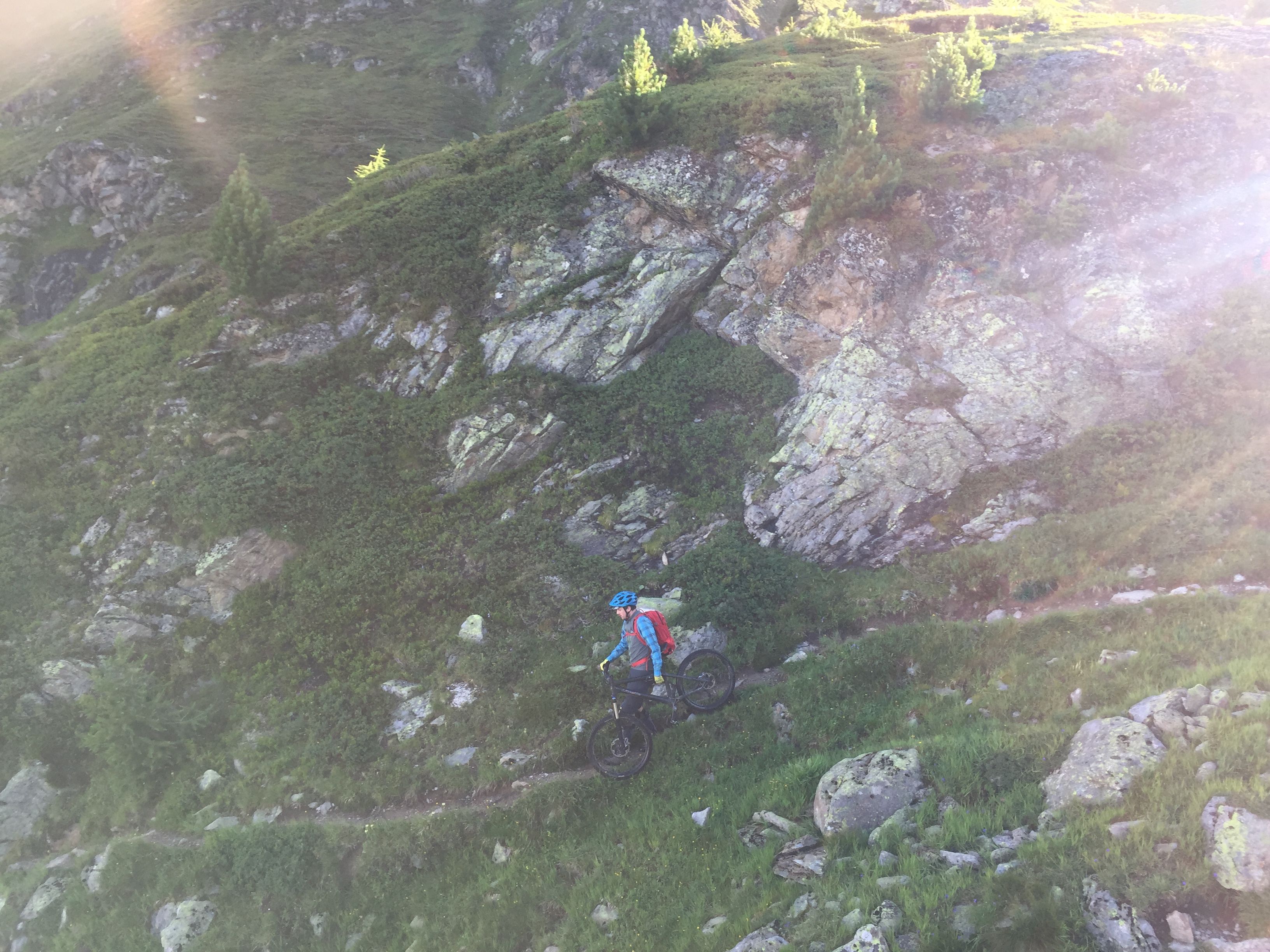Über der Baumgrenze. Hüttenübernachtung möglichst weit oben. Wenig Leute, Trailspass im S3 Bereich… ihr kennt den Grind… all das kam recht kurz familiär bedingt… deshalb wurden neue Konzepte in Erwägung gezogen. Möglichst schnell weit hoch und halbwegs familienfreundlich waren die Anforderungen. Die Idee war sich in Memmingen, also quasi auf halber Strecke zu treffen und dann in die Schweiz - genauer gesagt Davos als Startpunkt. Hoch mit der Bahn auf‘s Jakobshorn, an den Touris vorbei und die Ridgeline runter. Ein schöner Naturballertrail - sehr gut um reinzukommen.