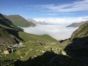 Kurz vor Chants entscheiden wir uns für den Geheimtipp und der Wirt sollte Recht behalten - im gesamten Übergang sind wir gottes seelen Allein und so haken wir den letzten Punkt auch noch ab. Wir befinden uns jetzt mitten in den Wolken. Es ist kalt und nass und erst am Talschluss steigen wir steil auf und kommen wieder über die Wolken und freuen uns noch ein paar Sonnenstrahlen abzugreifen und so genießen wir die letzten Meter über den Sertigpass auf 2739 Metern.