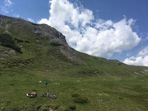 Auf etwa 2000m erreichten wir einen Sattel mit einer wunderschönen blumigen Wiese. Da wir super in der Zeit waren haben wir zum ersten Mal in unserer langjährigen Bikekarriere ein ausgedehntes Nickerchen gehalten. Kurz danach feierten wir diese Pause als richtungsweisende Weltidee. Jetzt, drei Jahre später, kann ich berichten, dass wir weiterhin eher wenig auf Pausen setzen beim ballern. Why?