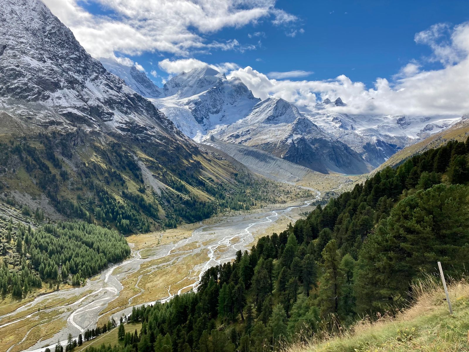 Frühstück gibt es im extra für uns gesperrten Ballsaal und es ist reichlich. Die Basisstation meldet für heute Niederschlag. Bei uns scheint die Sonne und so starten wir gut gelaunt Richtung Pontresina mit dem Auto und finden unseren Parkplatz direkt am Pumptrack. Während wir das Tal rausfahren ziehen dicke Wolken auf. Aber gut solange die kenianische Nationalmannschaft ihr Höhentraining weiter durchzieht kann es ja nicht so wild werden. Aber spätestens als sie uns mit einem Affenzahn wieder entgegenkommen beginnen wir der Wetterprognose aus Heidelberg zu glauben. Auch die Ebiker drehen an der letzen Hütte im Tal um während wir unsere Regenmontur anlegen. Nach einem kurzen Schreckmoment als Mark seinen Rucksack in Richtung des tosenden Flusses fallen lässt geht es weiter Richtung Talschluss. Der gewaltige Gletscher zeigt sich langsam während wir an perfekten riesigen Boulderblöcken vorbei auf zunehmend verblockteren Trails weiter aufsteigen. Der Regen nimmt zu und die Temperatur mit steigender Höhe stetig ab - klein und kurz vor dem Gletscher zeigt sich unsere Unterkunft in exponierter Lage - die Coaz Hütte.