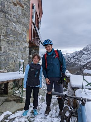 Die Nacht ist frostig. Der Tag beginnt mit einem nächtlichen Gang nach draußen zur Toilette. Die müden Augen erkennen, dass da viel Schnee überall liegt und es noch immer leicht schneit…na toll. Lieber noch mal hinlegen. Trotzdem sind wir früh beim Frühstück und obwohl viel Schnee liegt guter Dinge - denn die Sonne kommt raus. Auf Geheiß der Wirtin wollen wir uns den höheren Trail unter die groben Pneus packen - Doubledown und ab!