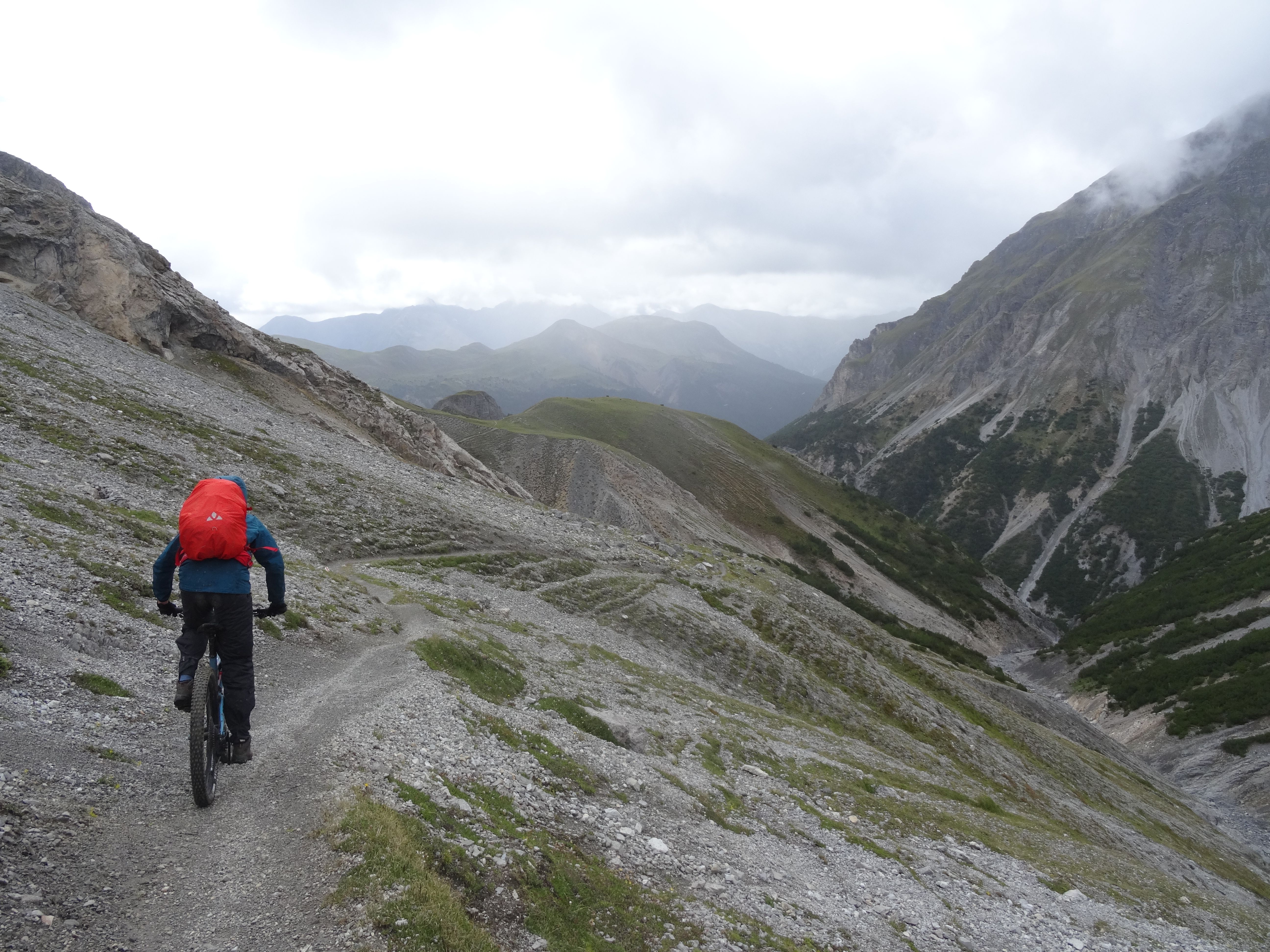 Die Prognose für den heutigen Tag ist ziemlich durchwachsen. Und wie bei jedem Trip wird uns erst am letzten Tag so richtig klar, dass wir ja heute auch noch die Heimfahrt zu bewältigen haben. Unser eigentlicher Plan sah vor, nochmal richtig einen rauszuhauen, aber am Frühstückstisch machen sich Zweifel breit und die Planungsmaschine springt an. Wir entscheiden uns, erstmal wie geplant oberhalb des Tals zu queren und dann zum Flüelapass abzufahren. Dann wollen wir weiter sehen. Die Wolken hängen tief und es dauert nicht lange, bis wir durch den Regen fahren. Der Trail ist saftig aber trotzdem sehr spaßig; anspruchsvoll aber für uns gut fahrbar. Nach 2 Stunden erreichen wir dann im kalten, strömenden Regen die Passhöhe auf 2380m. Hier wird erstmal was eingeworfen und die Kleider gewechselt.