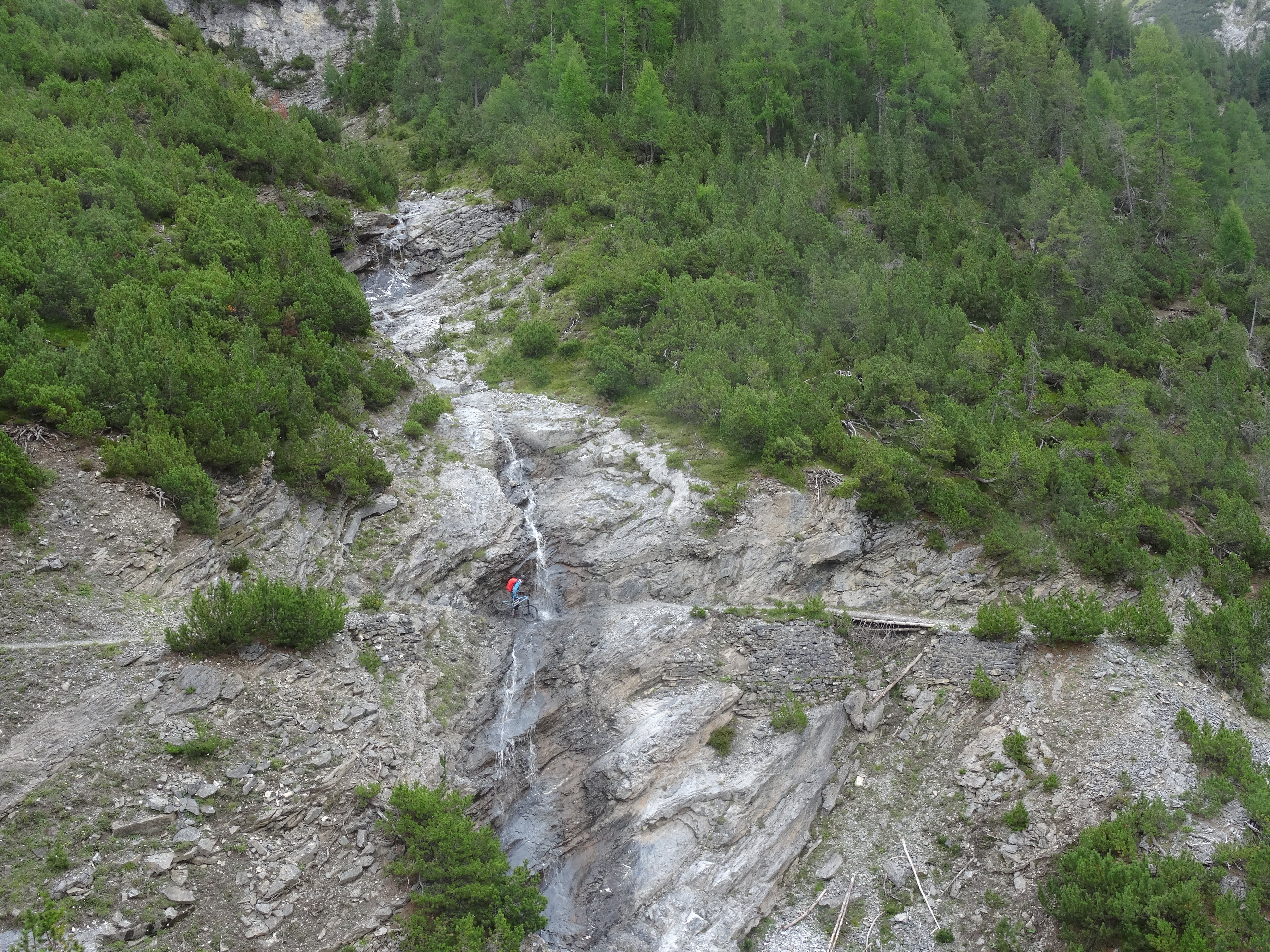 Die Kälte ist dank der Steilheit des Aufstieges auch gut auszuhalten. In dieser Sektion treffen wir tatsächlich mal ein paar Leute: Ein Trailrunner (verrückt! Wer macht denn so nen Quatsch! Hier ohne Rad auf dem Rücken hochzufahren macht ja überhaupt keinen Sinn!), eine Familie mit einem jungen Mädchen und ein Pärchen. Eine Herde Steinböcke würde unterhalb des Piz Languard den Trail blockieren und ein ziemliches Spektakel aufführen. Das motiviert uns. Murmeltiere haben wir mittlerweile schon viele gesehen, aber Steinböcke bisher noch nicht. Zum Abschluss der Steilstufe meistern wir eine kurze spannendere seilversicherte Sektion. Dann wechselt die Topographie und wir betreten eine traumhafte Mondlandschaft. Alles sehr trocken - Wir freuen uns doch einen kleinen Bachlauf zu finden, an dem wir noch vor dem Aufstieg zur Hütte die Flaschen auffüllen können, da es auf der Hütte kein fließendes Wasser gibt. Aktuell ist es niederschlagsfrei und man könnte fast von gutem Wetter reden. Entsprechend gut gelaunt machen wir uns auf das letzte Steilstück zur Hütte und wir können schon bald die Steinböcke sehen, die tatsächlich mitten auf dem Trail stehen und überraschend unbeeindruckt von uns sind. Wir kommen ziemlich nah ran, bevor sich die Herde dann doch in Gang setzt und uns mal ganz nebenbei zeigt, wie der Ibex sich im hochalpinen Gelände bewegt. Beflügelt nach dieser Begegnung bewegen wir uns zügig zum Bikedepot - die letzten paar Höhenmeter sind wir mit leichtem Gepäck unterwegs und so dauert es nicht lange, bis wir tatsächlich endlich bei der Chamanna Georgy sind. Nur noch ein paar spröde Schneereste sind hier und da zu sehen, haben aber keinen Einfluss auf die Wegbeschaffenheit.