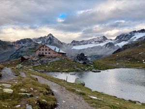 Außer uns sind nur noch drei weitere Gäste auf der Hütte. Ein Schweizer mit seinen beiden jungen Töchtern sitzt schon im Aufenthaltsraum und wärmt sich am Gasofen auf - es ist zapfig! Wir ziehen uns alles an, was wir dabei haben und begießen unsere Ankunft mit einer zünftigen Kanne Kräutertee. Rock’n’Roll! Die Hüttenwirte sind jung und entpuppen sich auch als Biker. Sofort tauschen wir unsere Pläne aus. Am Funkeln in den Augen des Wirtes lässt sich erkennen, dass er ganz angetan ist. Nach dem Essen schauen wir noch die 70 Höhenmeter weiter hoch zum Gipfel des Piz Languards in der Hoffnung, einen Blick auf den Sonnenuntergang werfen zu können.