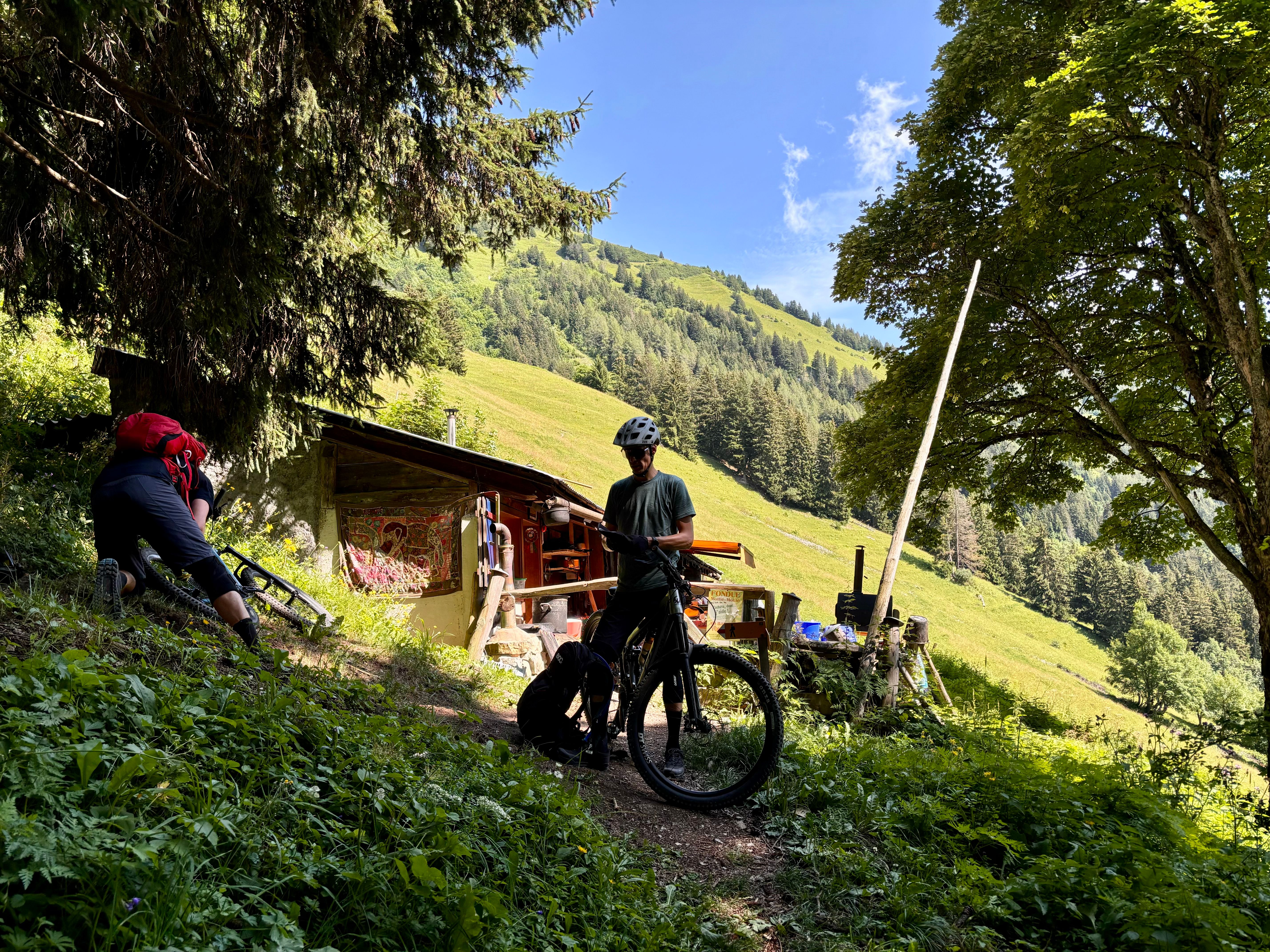 Der sanfte Roll-In fällt heute ruppig aus: Es gibt direkt ausgesetzt und verblockt aufs Fressbrett. Bienvenue en Suisse! Aber auch das Ambiente macht keine Kompromisse: Lakeview und blühende Blumenwiesen - der Standard ist gesetzt! Nach den ersten Metern wird der Trail etwas flowiger und es geht in einen verwunschenen Wald. Wir haben Bock und einige Spitzkehren wollen gemeistert werden - wenn nicht jetzt dann vermutlich nie mehr in diesem Leben! Challenge accepted und wir liefern. Zufrieden nähern wir uns dem See. Die Köpfe werden im hiesigen Dorfbrunnen wieder auf normale Betriebstemperatur heruntergekühlt, bevor wir wieder den Ballerbus packen.