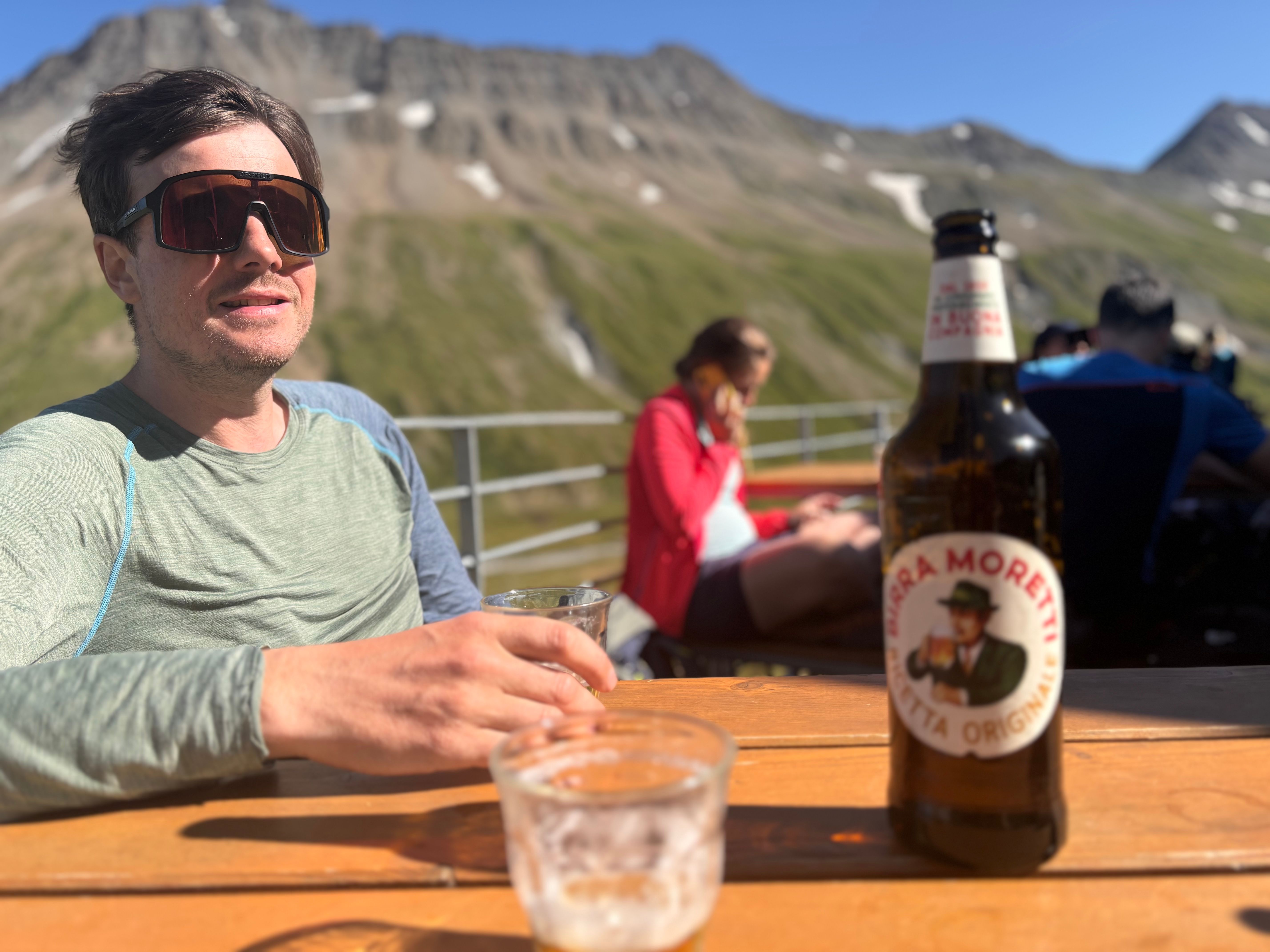 Wir blasen jetzt die letzten Meter mit wehenden Trailhemden die Asphaltstraße zum Auto runter bevor wir unter der Outdoordusche unser wohlverdientes Kaltgetränk genießen. What a Day! Was an diesem göttlichen Tag noch fehlt, wäre eine Audienz beim Papst. Und so finden wir uns ein paar Minuten später auf der Gartenterrasse des Pontifex im Abendlicht bei Pizza und Aperyolo. Auf der gegenüberliegenden Seite liegt das Ziel für Morgen - der Gipfel der Punta Leysser…wohlig fallen wir in unsere Kinderbetten, während der Traum von Andy zu Mark überspringt…