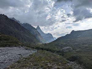 Der Sonnenaufgang an diesem Tag ist nicht mit dem wolkenlosen Feuerwerk am Vortag zu vergleichen. Die Sonne bleibt teilweise hinter Wolken versteckt und entwickelt nur wenig Kraft über dem ruhigen Val Veny. Dennoch ein toller Moment, um nochmal die vergangenen Tage Revue passieren zu lassen, alleine die Natur zu geniessen, oder - wie Mark - den kritischen Abbruch der Tour zu planen. Sein Knöchel ist stark geschwollen und die Belastung bergauf und bergab führt immer wieder zu stechenden Schmerzen. Eigentlich war für heute nochmal ein Highlight geplant mit einer aussichtsreichen Gipfeltour hoch überm Val Veny, aber in dieser Form macht das für Mark wenig Sinn und die Truppe entscheidet sich solidarisch gemeinsam die Abfahrt anzugehen. Oder haben Andy und Christian auch keinen Bock mehr und wollen auf die Autobahn?