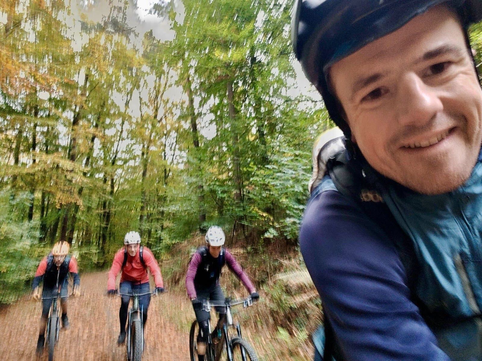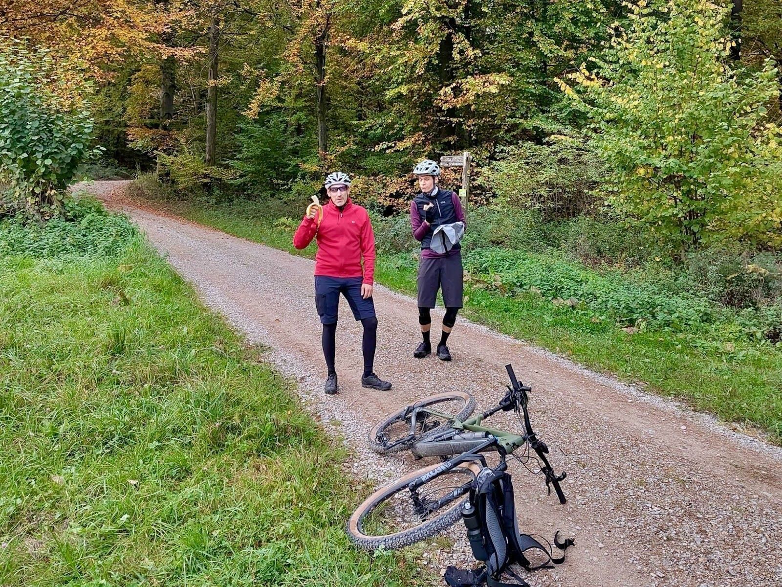 Über den Weißen Stein rollten wir ins Eiterbachtal – der Odenwald zeigte sich von seiner schönsten, aber kältesten Seite. Kurz bevor wir in den Adlersteintrail einstiegen, war’s dann soweit: erste längere Pause, 10 Uhr, Sonne! Endlich auftauen, Banane, belegte Brote, Lachen – und der Einsatz der Style-Polizei: Christian in Affenfarben. Normalerweise Schwarz-Grau-Standard, diesmal farblich eskaliert – gewagt, aber genehmigt.