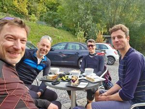 Felix war schon seit 6:31 Uhr wach, hatte unterwegs noch seinen Bruder Matthias aufgelesen, sodass die Stiefgeschwister komplett waren. Um 7:40 Uhr holten sie Mark und Christian in Heidelberg am Bahnhof ab – und ab da ging’s los. Die ersten zwei Stunden bestanden vor allem aus Kälte, Atemwolken und der verzweifelten Frage, warum wir das eigentlich tun. Zu kalt für Fotos, zu kalt für Sprachnachrichten – die Meute im Livekanal wartete vergeblich auf Updates.